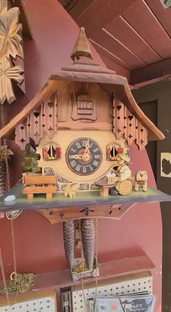 Die mechanische Kuckucksuhr "Berghütte mit Hund" entführt Sie in die idyllische Ruhe einer alpinen Berghütte, tief verwurzelt in der Tradition des Schwarzwaldes. Dieses Prachtstück deutscher Handwerkskunst fängt den Geist der Berge ein, mit einem sorgfältig geschnitzten Bernhardiner, der geduldig auf der Veranda einer gemütlichen Hütte wartet. Neben ihm genießt eine heitere Figur ein frisch gezapftes Bier, was die herzliche Gastfreundschaft und die Freuden der Bergwelt symbolisiert.